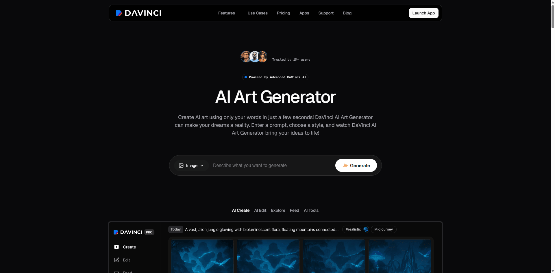 DaVinci AI differentiates itself with specialized tools for logos, tattoos, and avatars. Beyond basic text to image generation, it includes DaVinci XL custom model alongside Stable Diffusion and DALL E 3.