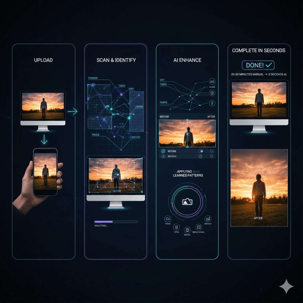 The technology uses machine learning basically, the software has analyzed millions of photos to understand what "good" editing looks like. When you upload your image, it recognizes patterns: faces, skies, objects, lighting conditions. Then it applies appropriate fixes based on what it's learned.