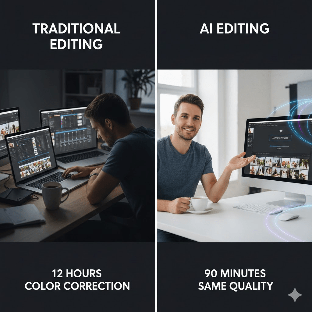 - AI editing: ~3 seconds per photo + 20 minutes manual review = 30 minutes total