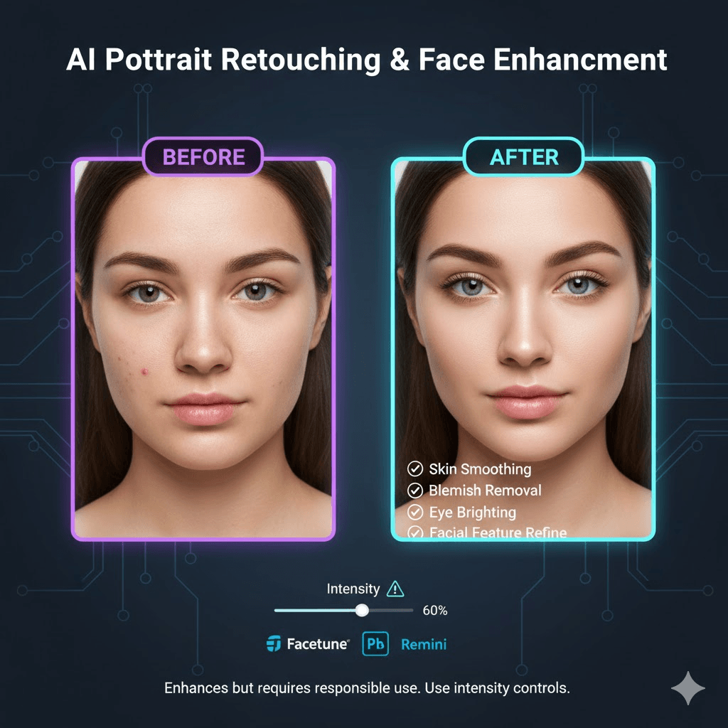 The good: AI is actually pretty impressive here. Tools like Facetune and Remini can do in 10 seconds what used to take 20 minutes of careful Photoshop work. Skin smoothing has gotten good enough that it doesn't create that weird plastic looking effect anymore.