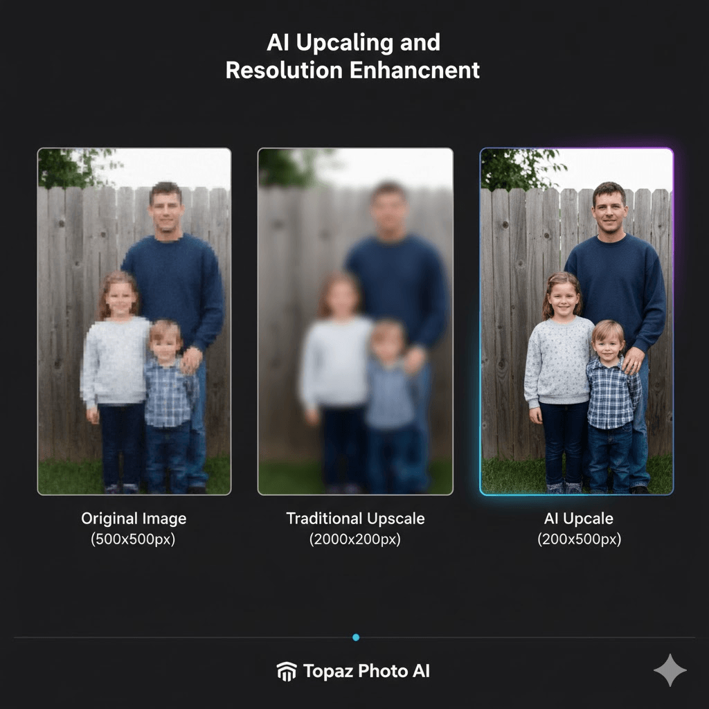 Sort of. AI upscaling tools (Topaz, Remini) can make blurry images sharper and add detail, but here's the catch: they're not recovering lost information. They're making educated guesses about what should be there based on similar photos they've seen.